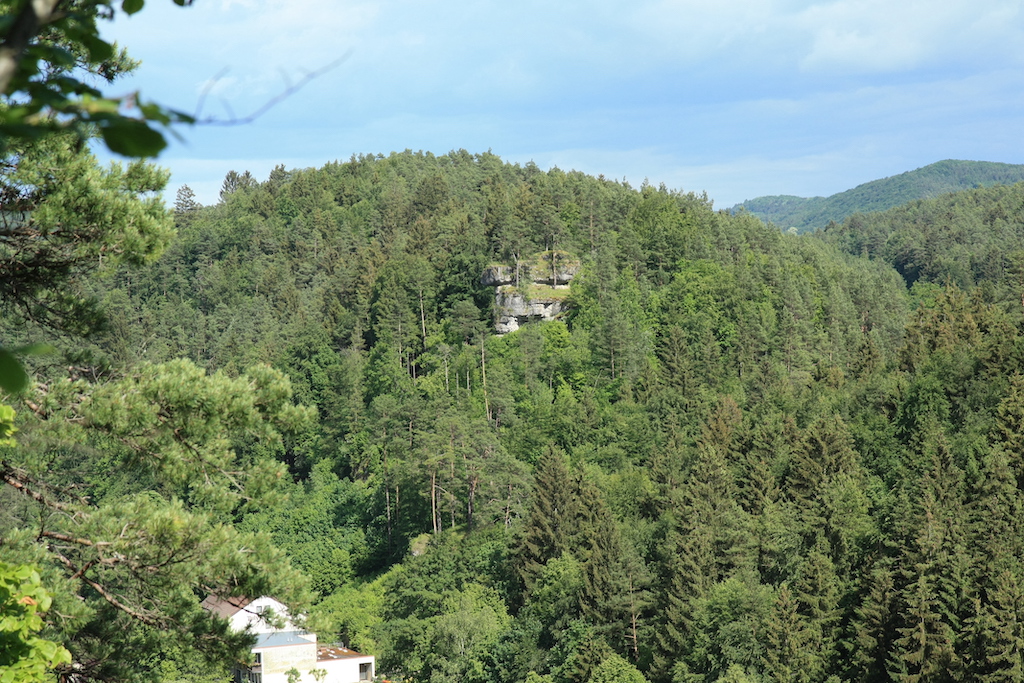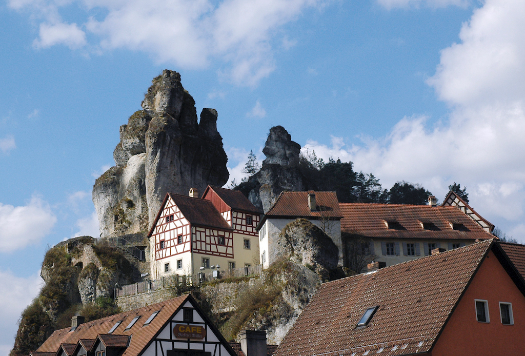 Etwa zwei Kilometer östlich der Püttlachmündung liegt das Felsendorf Tüchersfeld inmitten einer spektakulären Natur. Auf und unter den hohen Felstürmen wurden die im 13. Jh. erstmals genannten Burgen Obern- und Niedertüchersfeld errichtet. Um 1500 ist Oberntüchersfeld nur mehr Burgstall. In Niedertüchersfeld etablierte sich ab 1700 eine jüdische Ansiedlung. In der ausgebauten Burgruine wohnten bis zu 44 Personen in der fortan als Judenhof bezeichneten Anlage. In den Jahren 1981 bis 1983 wurde der Gebäudekomplex gründlich renoviert, um dort das Fränkische Schweiz-Museum eröffnen zu können. Das Regionalmuseum ist jederzeit einen Besuch wert.