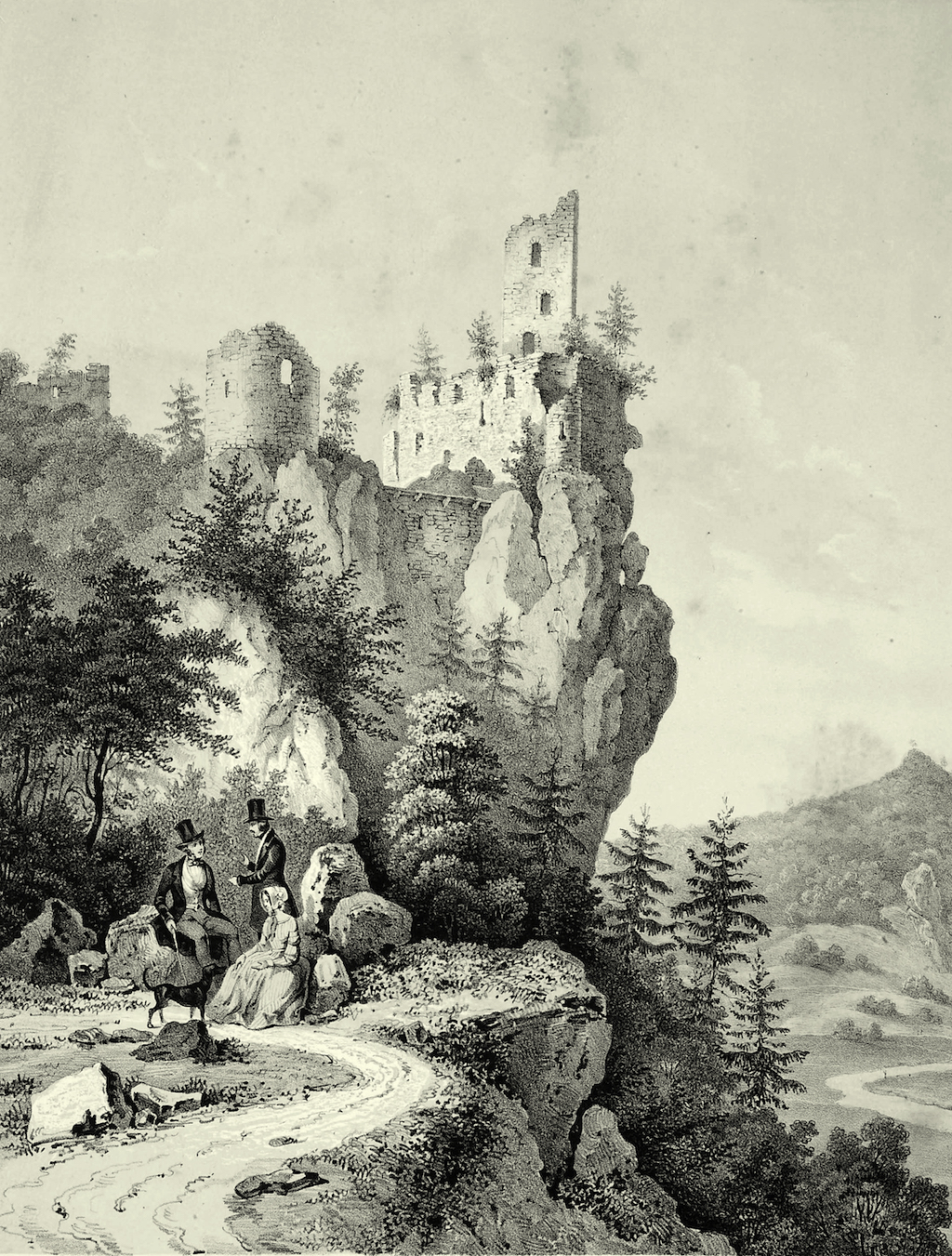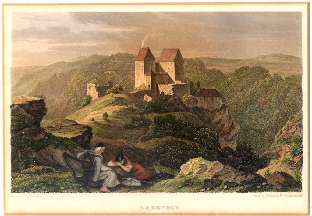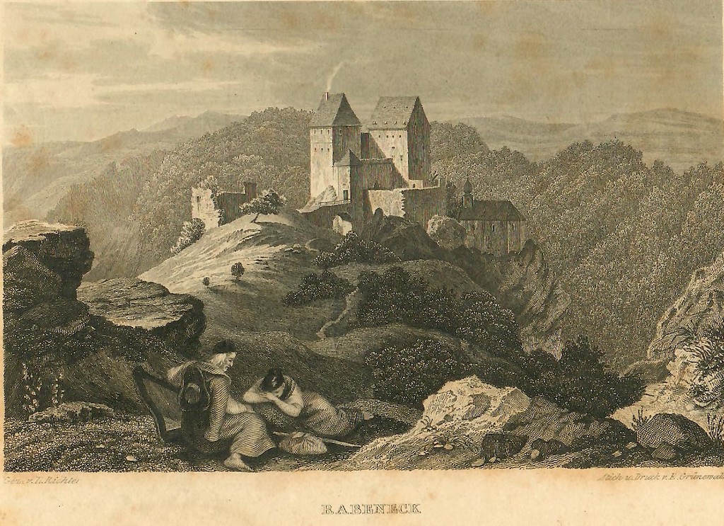 Arndt beschreibt damit Burg Rabeneck, auf einem spektakulären Höhensporn über der Wiesent gelegen. Zimmermann spricht angesichts der Talenge vor Rabeneck gar vom „Tal des Todes“. Ebenso beeindruckt war Goldfuß: „…so scheint endlich das sich krümmende Thal von gethürmten Felsen geschlossen zu seyn. Allein nach einigen Schritten gewahrt man den Irrthum, und es treten auf einmahl die alten grauen Gemäuer der Burg Rabeneck, auf den höchsten Felsen gegründet, hervor. Kein Platz konnte besser gewählt werden, ein Raubnest zu gründen, dessen Äußeres schon dem einsamen Reisenden Furcht und Schrecken einflößte. Unfern der Mühle, über welche die Felsen und Mauern der Burg herüberhängen, besteiget man, auf einem schmalen Fußpfade, den Berg und gelanget zuerst zu dem Eingange der kleinen Schloßkapelle.“