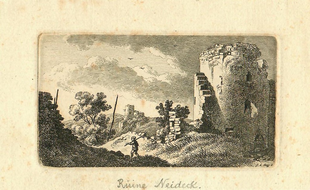 Nur wenige Zeit später wurde die Ruine von dem jungen Ernst Moritz Arndt, der sich noch in jungen Jahren zum schreibenden Propagandisten gegen die napoleonische Besetzung Deutschlands entwickeln sollte, während seiner Reise von Bayreuth nach Wien mit ähnlichen Emotionen in Augenschein genommen: „Ich will hinaus und dann beschreiben die Ruinen von Neideck, die schönsten Trümmer einer Burg, die ich bis jetzt auf teutschem Boden sah, …….diese Ruinen des alten Schlosses Neideck sind die größten und romantischsten, so ich gesehen habe. Tausend Schlösser mögen höher und lieblicher und weitaussehender gelegen haben, wenige sicher so fest und so stattlich, als dieses, bis das Pulver die Schlösser und Ritter niederwarf…... Auf dieser Nordostseite des Berges ersah ein Ritter einen Platz für sich und gründete eine mächtige Burg. Sie war von der ersten Abtheilung bis zum Ende mit allen Einfassungen ongefähr 300 Schritte lang und mehr und weniger von 140 zu 70 Schritten breit.“ Nach diesen überwältigenden Eindrücken der Jungliteraten kann der Blick von der Neideck nach Muggendorf gerichtet werden.