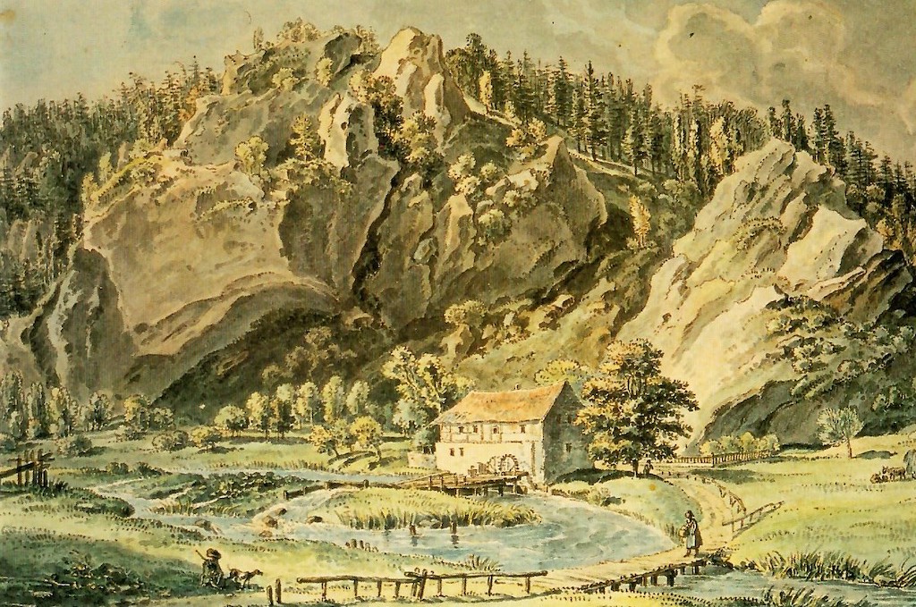 Während die Müller vergangener Jahrhunderte ihre Familien nur mit Mühe und Not durch den kärglichen Verdienst aus ihrer schweißtreibenden Arbeit ernähren konnten, hatten die Vertreter der Romantik eine deutlich andere Sichtweise der Idylle: „Enger wird das Thal, je weiter wir gehen, schroffer die Felsenwände, düsterer der Wald, und näher hören wir schon das Rauschen der Baumfurther Mühle. Auf der niedrigen Brücke gehen wir über die Wiesent, die nahe von einem Damme sich brausend herabstürzet. Ein Häuschen ist hier mahlerisch unter dem Überhange eines Felsen gebauet; auch besuchen wir eine Quelle, die im Mühlenhofe aus dem Felsen entspringt und in deren innerste Tiefe die Forelle hinabfliehet, wenn sie unser rauschender Fußtritt erschreckt.“