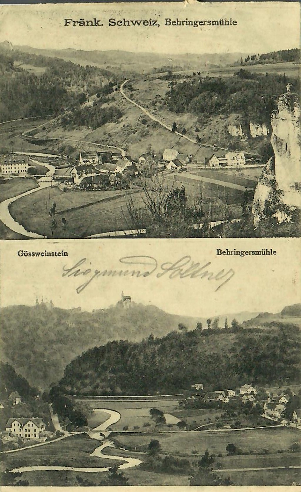 Die Lage des Aufeinandertreffens von vier Tälern erfuhr in einer Reisebeschreibung Joseph Hellers aus dem Jahr 1829 eine charkteristische Beschreibung: „Behringersmühle, Bbg. Kath. im Ldgr. Pottenstein mit 94 Einw., einer Mahl- u. Schneidmühle, einer Ziegelbrennerei, aber ohne Wirthshaus. Sie liegt in einer sehr interessanten Gegend, 1 1/2 Stunde von Muggendorf, in einem Kessel, wo die 4 Thäler an einander stoßen, nämlich das Gößweinsteiner, das Engelhardsberger, das Kirchahorner und das Tüchersfelder. Auch vereinigen sich hier die Eschbach und die Puttlach mit der Wiesent. Schön ist der Anblick nach Gößweinstein, aber noch weit überraschender und schöner, wenn man eine Strecke des Fußwegs gegen Schweigelberg hinaufgeht und in das Thal herabschaut, dann die Vereinigung der Flüsse, und auf der entgegengesetzten Höhe das romantisch liegende Gößweinstein erblickt.“