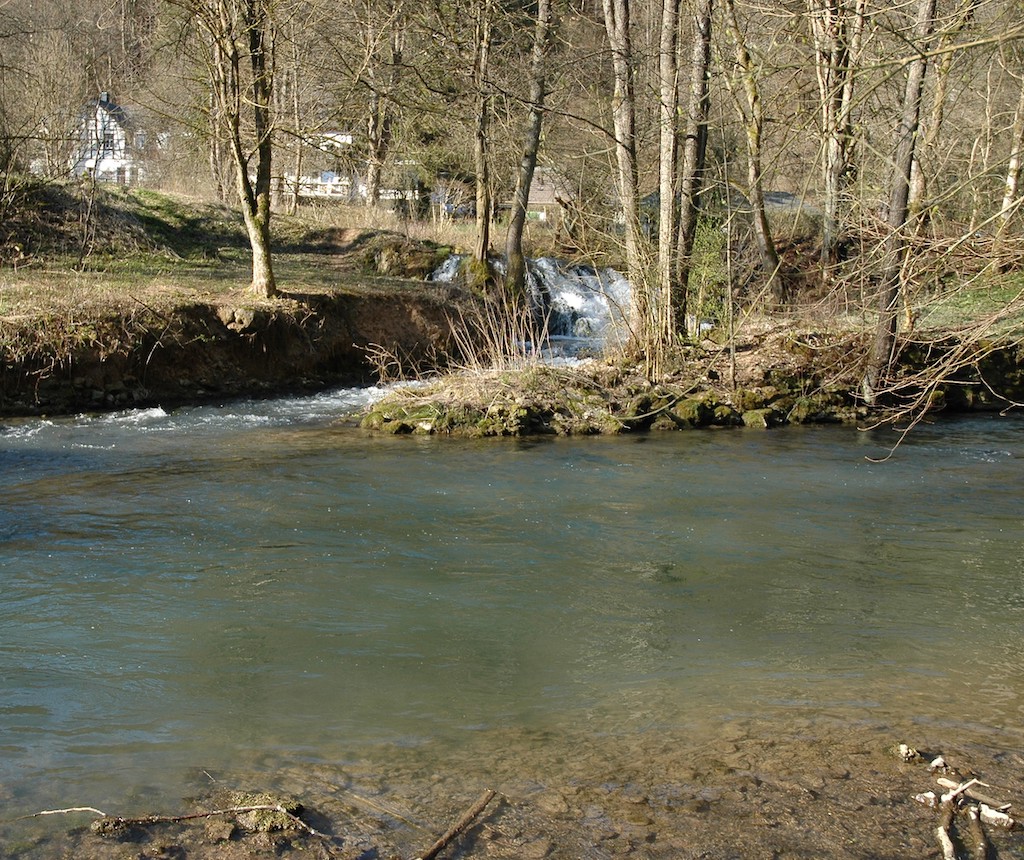 „Jene Mühle wird die Stämpfermühle genannt, und stehet mit einer Naturmerkwürdigkeit in Verbindung. Ihr Werk wird nämlich nicht von dem vorbeirauschenden Flusse getrieben, sondern drey Quellen, die einige Schritte von dem Gebäude entspringen, setzen ihre Räder in Bewegung. Zwey derselben brechen mit starken Strömen, gewaltsam aus Felsengewöbern hervor, und eine dritte ergießt ihren sanfteren Wasserstrom in der Mitte der Wiese. Muntere Forellen siehet man aus ihnen hervorschlüpfen und wieder in ihre verborgenen Tiefen hinabschießen.“ Soweit die Beschreibung von Georg August Goldfuß.