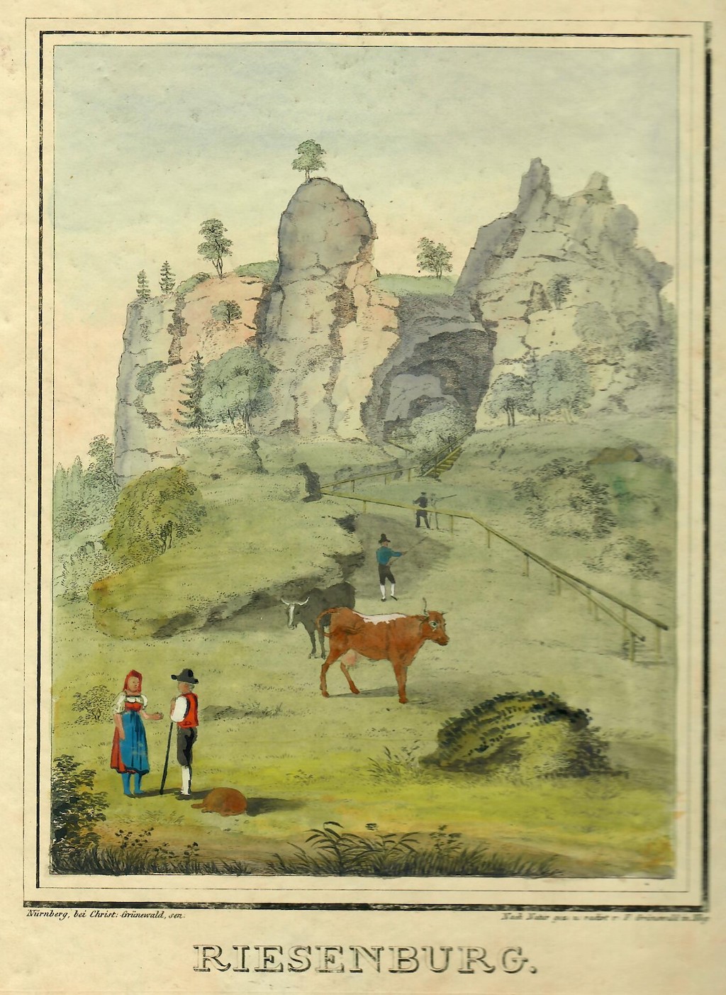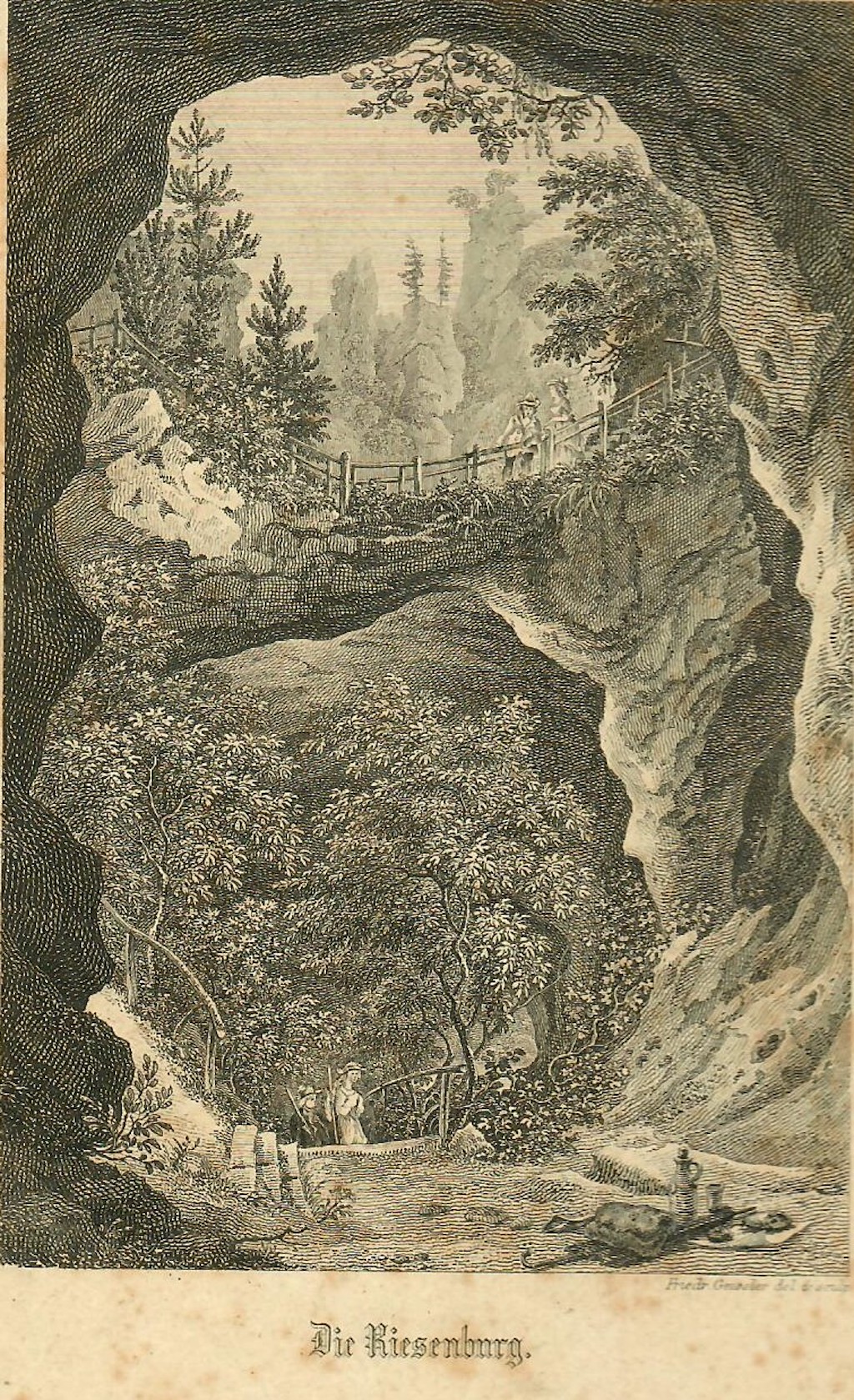 Die Romantiker, wie August Goldfuß überhöhten die Versturzhöhle in ihren Darstellungen zumeist ganz in der Ideologie ihrer Zeit: „Furchtbar öffnet sie zwischen zwey Felsenkolossen ihr hohes Thor mit seinen doppelten Bogen; steil ziehet sich der Weg hinauf in den Burghof, und dunkle Portale und Fenster scheinen in den Tartarus hinab zu führen. Kommt man von Engelhardsberg her, so schauet man zuerst von der Spitze einer Klippe hinab in tiefes majestätische Gebäude, steht auf den doppelten Bogen des Thores die Blumen, das Gras und das Gesträuch, die sanft von dem Winde beweget werden. Durch ein niedriges Seitenthor tritt man in den grünen, von Felsen umschlossenen, Platz. Um das erhabene dieses Ortes ganz zu genießen, muß man sich hier unter dem Überhange des Felsen, der die Vorhalle zu einer geräumigen, doch nicht tiefen, Hölung bildet, nieder lassen, durch das Portal in das Thal hinabschauen, wo der grünlichte Strom vorbeirauschet und sich dem freien Spiele der Phantasie überlassen.“ Auch bei Arndt gehörte sie zu den attraktivsten Naturobjekten: „Ich möchte sie gern das Schönste nennen, was ich in diesen Gegenden gesehen habe, wenn die Wunder unter der Erde nicht so ganz anders auf das menschliche Gemüth wirkten, als alles was noch unter den Strahlen der Sonne liegt. Mit Recht heißt es eine Riesenburg. Für Riesen thürmte sie die ewige Natur, so groß und furchtbar steht sie da, wenn man von unten hinauf durch ihre Thore schaut in die heiligen Gewölbe hinein und dann wieder zu dem Thron der Riesen rechts und links.“ Ludwig Richter sah auf Grund einer Erzählung gar zwei Riesen in der Höhlenruine im Kampf gegeneinander: „Zwei Riesen hatten hier gewohnt, u. sich zu Zeiten bekämpft, der eine davon hieß Heinrich, der andre glaub ich Erdmann, und schossen mit „Fitschepfeilen aufeinander.“August Graf von Platen beschrieb die Besteigung am 31. Mai 1821: „Es gesellten sich noch zwei andere Studenten zu uns…wir besuchten noch die Riesenburg und den Adlerstein, die mir schon aus meinen früheren Wanderungen bekannt waren. In diesen herrlichen Gebirgsgegenden fühlten wir uns alle auf das heiterste aufgelegt.“